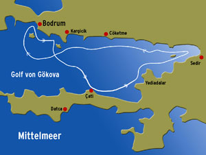 im Golf von Gökova beginnt im Karada-Yachthafen von Bodrum. Die tiefen